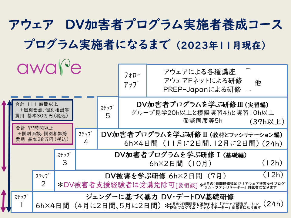 ※8/24、25の「DV被害女性プログラム・ファシリテーター養成講座」(後期)を追加受講すると「アウェア被害女性プログラム・ファシリテーター」対象者になります。