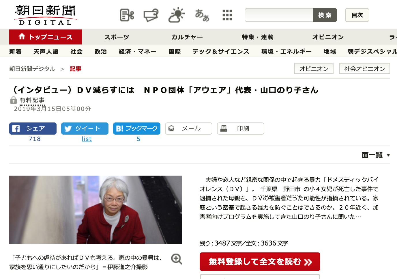 2019年3月15日 朝日新聞インタビュー記事 「子どもへの虐待があればDVも考える。家の中の暴君は、家族を思い通りにしたいのだから」