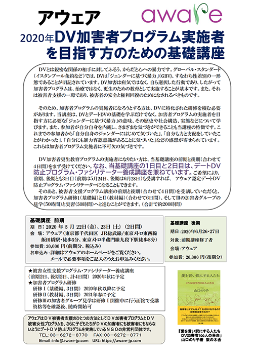 DV基礎講座とデートDV防止プログラム・ファシリテーター養成講座を兼ねた講座を5月と6月に開催します。詳しくはこちらをご覧ください。